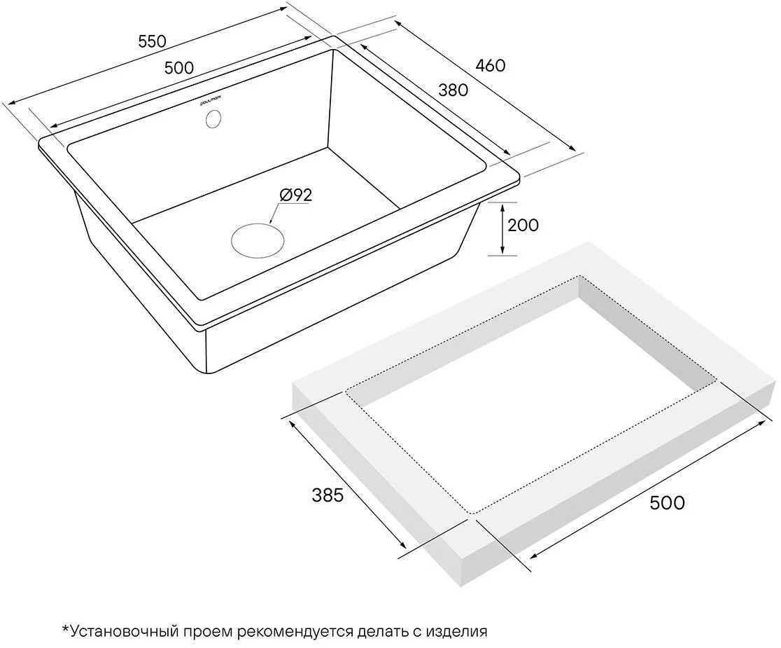 Мойка для кухни Paulmark GERA PM205546-GR 55x46 серый, Ширина: 55 см, Длина: 46 см, Глубина чаши: 20 см, Цвет: Серый, Материал: Гранит