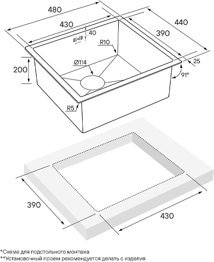 - Способ монтажа: под столешницу, вровень со столешницей, в столешницу сверху