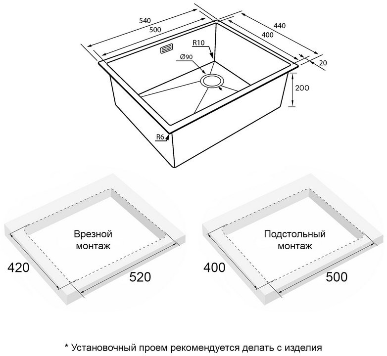 - Размер мойки 54 x 44 см
