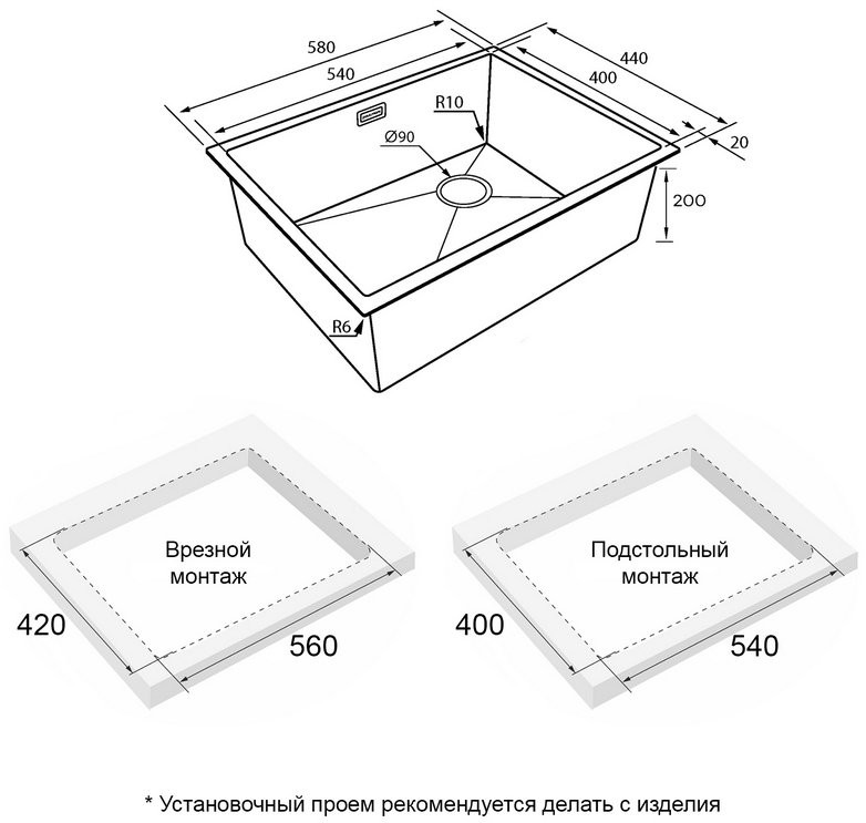 - Размер мойки 58 x 44 см