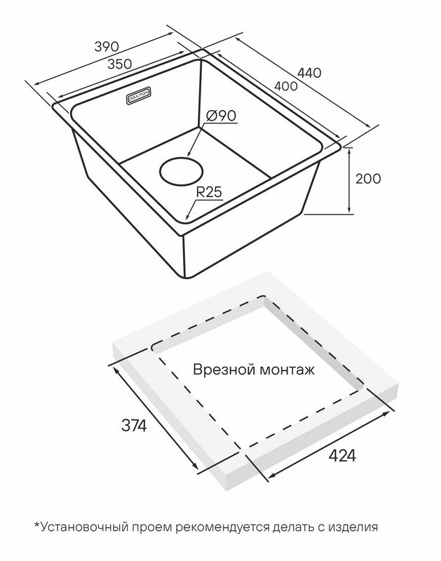 - Размеры мойки (ДхШ) - 39x44 см
