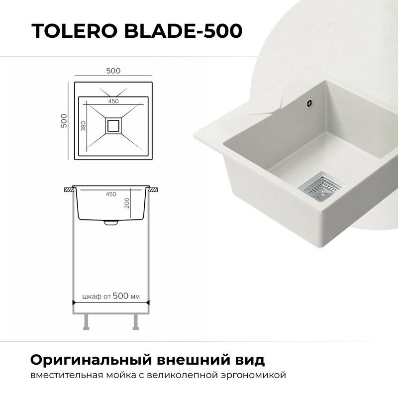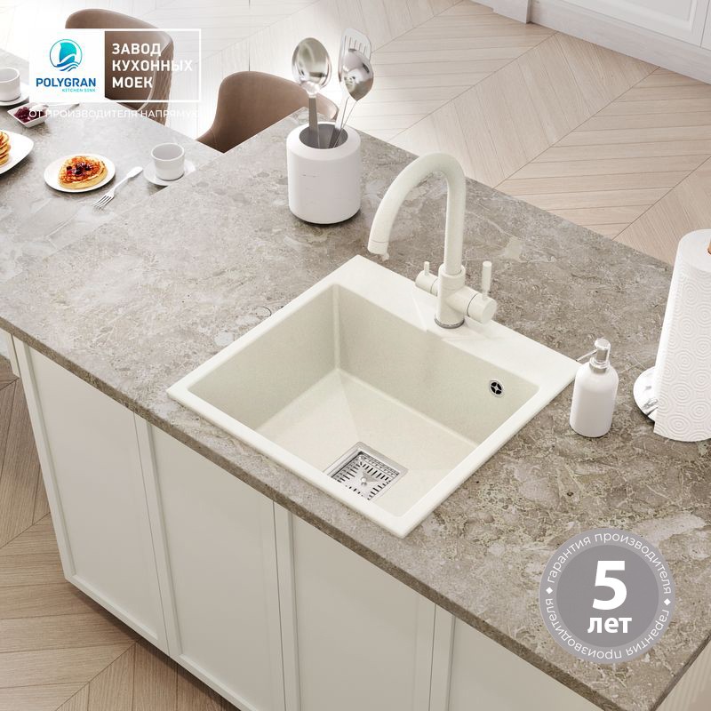 Мойка кухонная Polygran BLADE 500, Белый Хлопок №36, врезная на столешницу, искусственный камень, квадратная, размеры (ШхД): 50x50 см