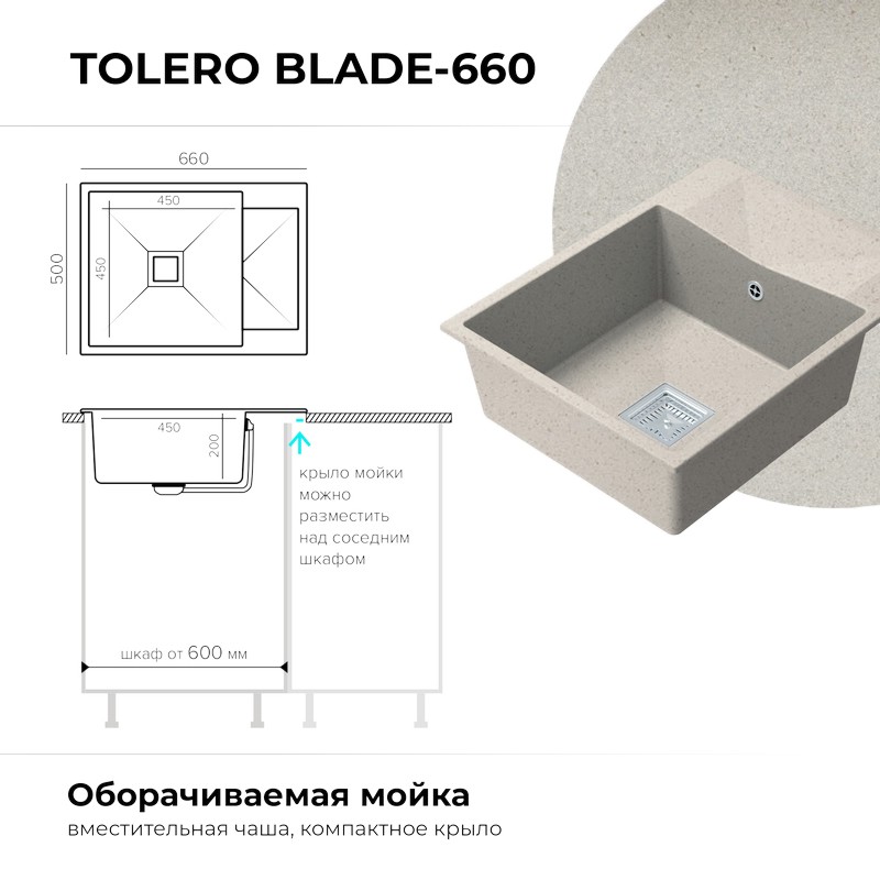 Мойка кухонная Polygran BLADE 660, Кремовый №327, врезная на столешницу, искусственный камень, размеры (ШхД): 66x50 см