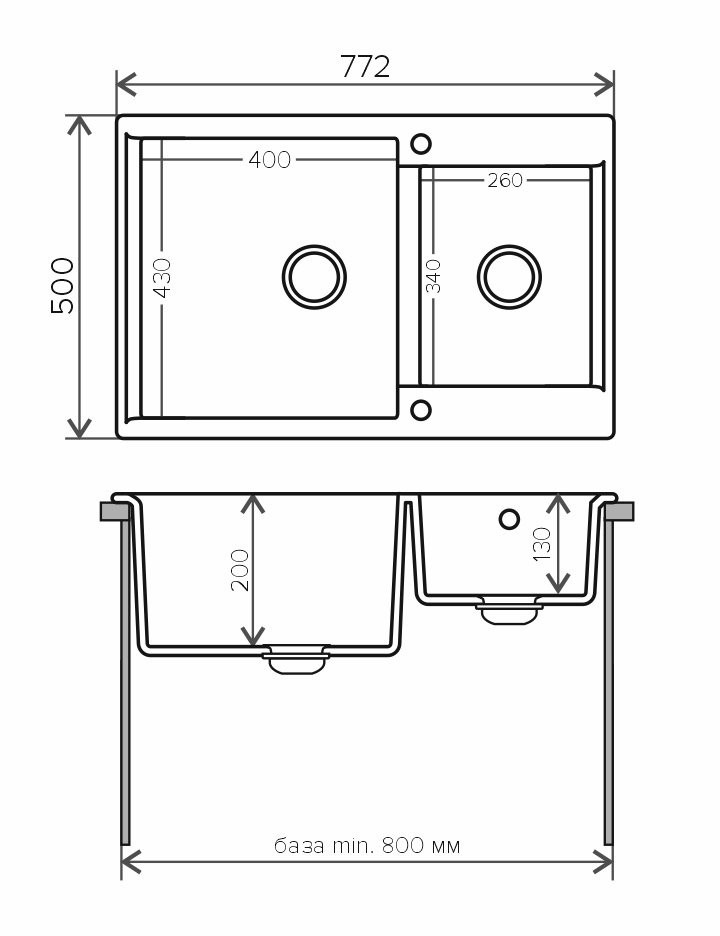 POLYGRAN Brig-772- это средняя прямоугольная мойка с двумя чашами с небольшим крылом (стекателем). Установка мойки универсальная, так как нет готовых отверстий под смеситель при монтаже мойку можно поворачивать и дополнительная чаша с крылом может быть как справа так и слева. За счет крыла у мойки широкая площадка для установки смесителя которую так же можно использовать для размещения не ней дополнительных аксессуаров, например под отдельный кран для фильтрованной воды или встраиваемый дозатор для моющих средств.