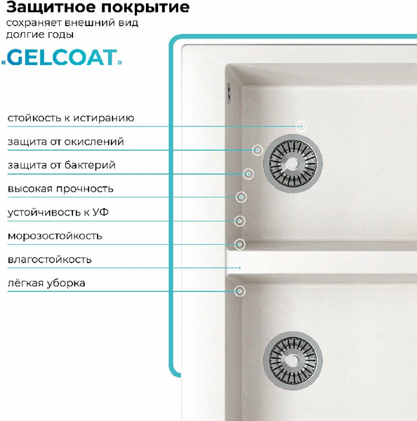 С целью улучшения физико-механических свойств моек и улучшения эстетического вида, на кухонные мойки Полигран наносится гелькоутное покрытие. После обработки на их поверхности образуется красивый полуглянцевый слой, за счет которого мойки послужат более 10 лет без потери внешнего вида и своих прочностных свойств.