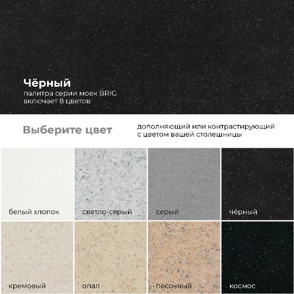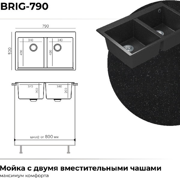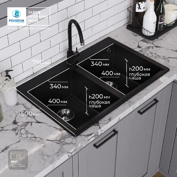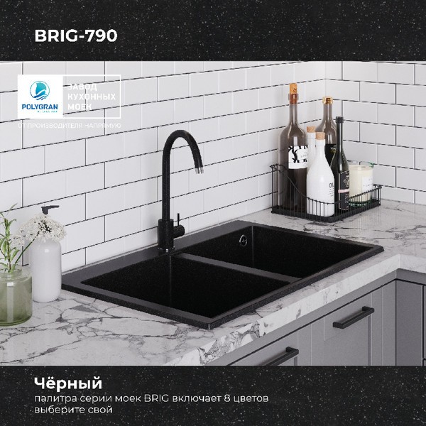 Кухонная мойка Brig-790. Под брендом производятся мойки эконом класса, в которых наилучшим образом сочетаются цена и качество. Мойка из искусственного камня универсальна, так как идеально вписывается в дизайн любого кухонного гарнитура, а в эксплуатации этому изделию нет равных — литые композиты выдерживают температурные колебания, имеют высокую прочность, бесшумность, нулевое водопоглощение, стойкость к пищевым и химическим красителям и для ухода за мойкой можно использовать любые неабразивные моющие средства.