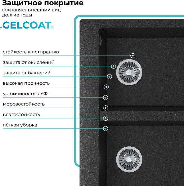 С целью улучшения физико-механических свойств моек и улучшения эстетического вида, на кухонные мойки Полигран наносится гелькоутное покрытие. После обработки на их поверхности образуется красивый полуглянцевый слой, за счет которого мойки послужат более 10 лет без потери внешнего вида и своих прочностных свойств.