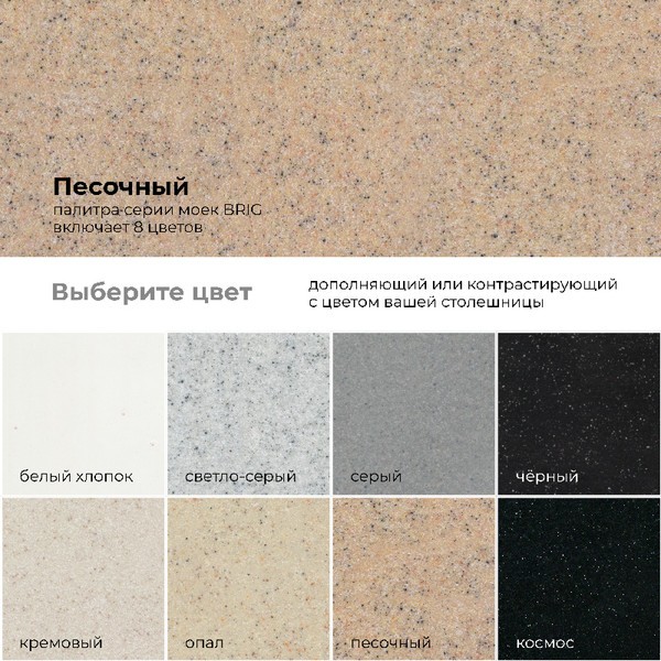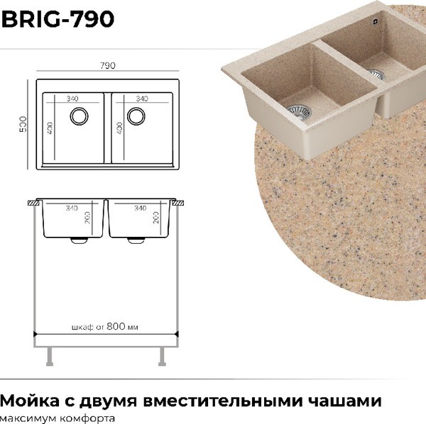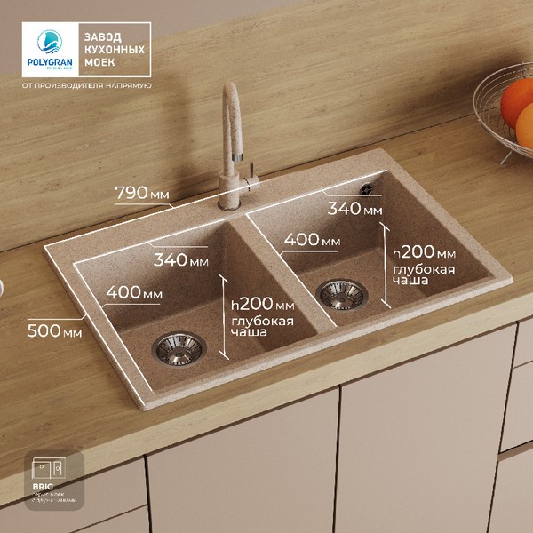 Кухонная мойка Brig-790. Под брендом производятся мойки эконом класса, в которых наилучшим образом сочетаются цена и качество. Мойка из искусственного камня универсальна, так как идеально вписывается в дизайн любого кухонного гарнитура, а в эксплуатации этому изделию нет равных — литые композиты выдерживают температурные колебания, имеют высокую прочность, бесшумность, нулевое водопоглощение, стойкость к пищевым и химическим красителям и для ухода за мойкой можно использовать любые неабразивные моющие средства.
