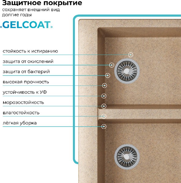С целью улучшения физико-механических свойств моек и улучшения эстетического вида, на кухонные мойки Полигран наносится гелькоутное покрытие. После обработки на их поверхности образуется красивый полуглянцевый слой, за счет которого мойки послужат более 10 лет без потери внешнего вида и своих прочностных свойств.