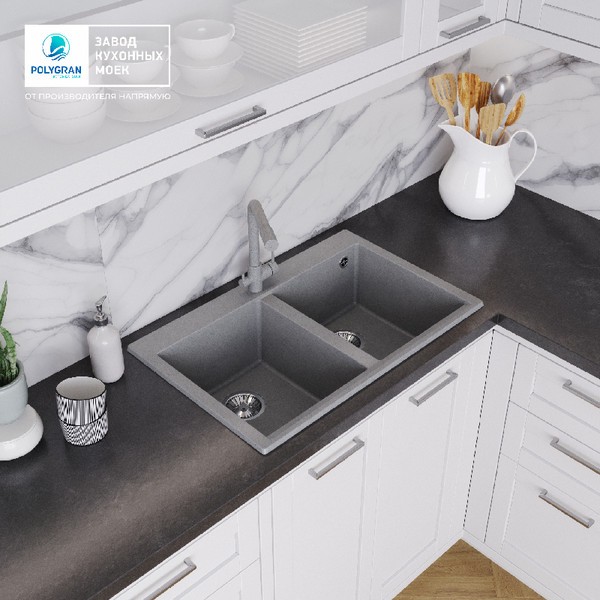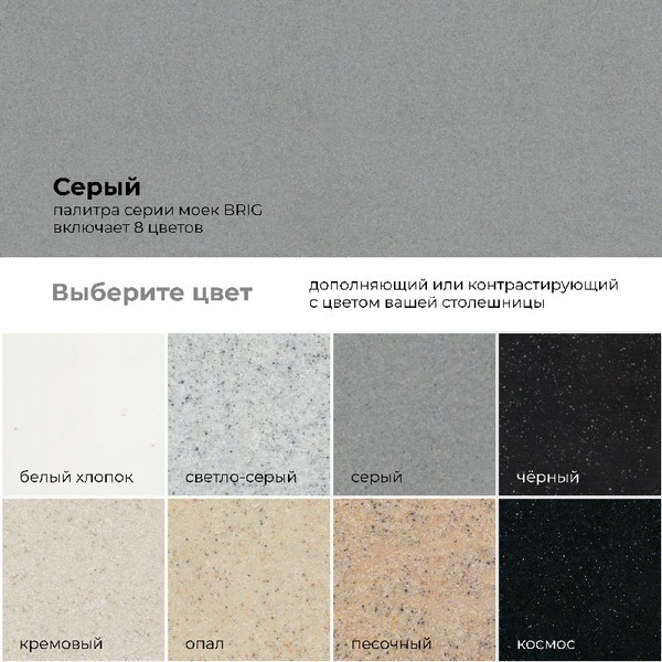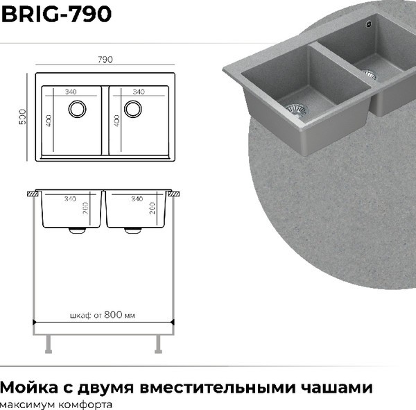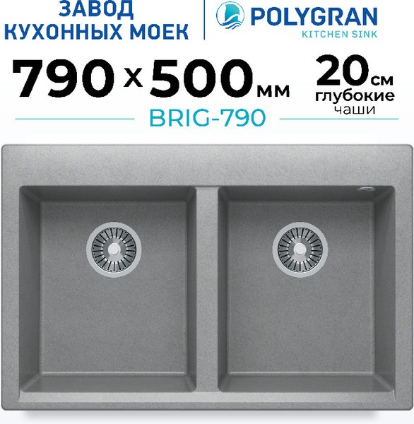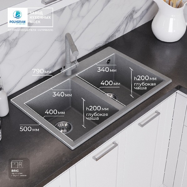 Кухонная мойка Brig-790. Под брендом производятся мойки эконом класса, в которых наилучшим образом сочетаются цена и качество. Мойка из искусственного камня универсальна, так как идеально вписывается в дизайн любого кухонного гарнитура, а в эксплуатации этому изделию нет равных — литые композиты выдерживают температурные колебания, имеют высокую прочность, бесшумность, нулевое водопоглощение, стойкость к пищевым и химическим красителям и для ухода за мойкой можно использовать любые неабразивные моющие средства.