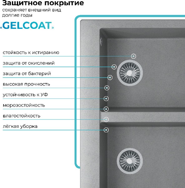 С целью улучшения физико-механических свойств моек и улучшения эстетического вида, на кухонные мойки Полигран наносится гелькоутное покрытие. После обработки на их поверхности образуется красивый полуглянцевый слой, за счет которого мойки послужат более 10 лет без потери внешнего вида и своих прочностных свойств.