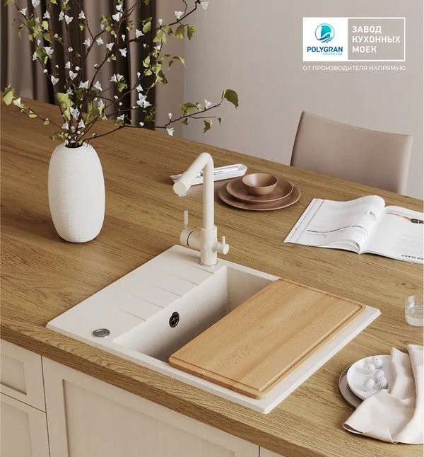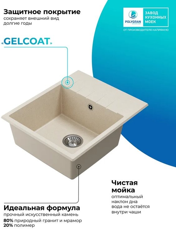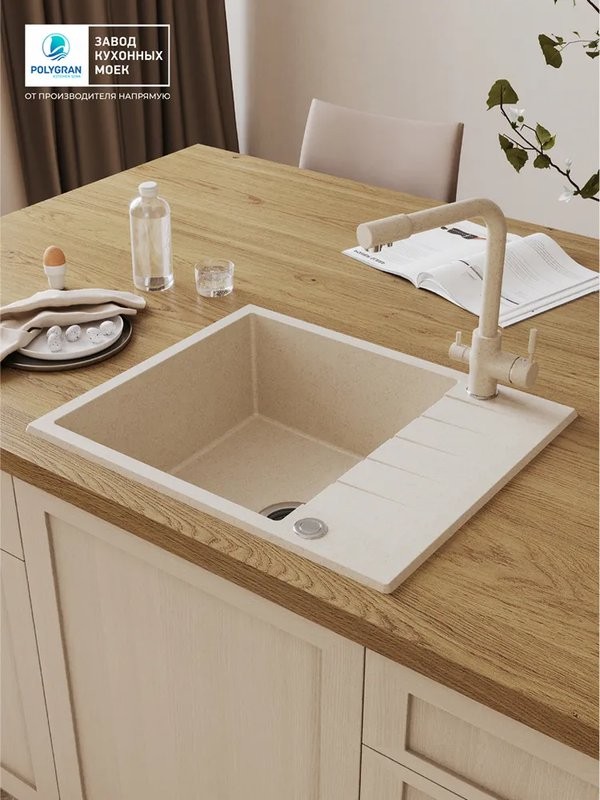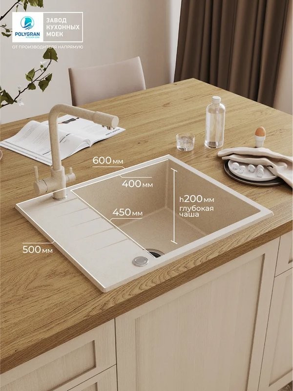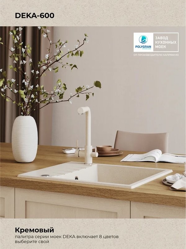 Мойка для кухни Polygran DEKA 600 60x50 кремовый, Ширина: 60 см, Длина: 50 см, Глубина чаши: 20 см, Цвет: , Цветной, Материал: Искусственный камень