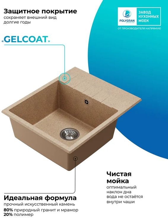 Мойки Polygran обладают высокой механической прочностью благодаря высокотехнологичному производству литья материала, 80% составляет натуральная мраморная крошка и 20% экологически чистого связующего элемента. Материал обладает высокой термоустойчивостью. Добавление специально разработанной добавки в связующий элемент (гелькоут) позволит легко удалить любые загрязнения с поверхности мойки.