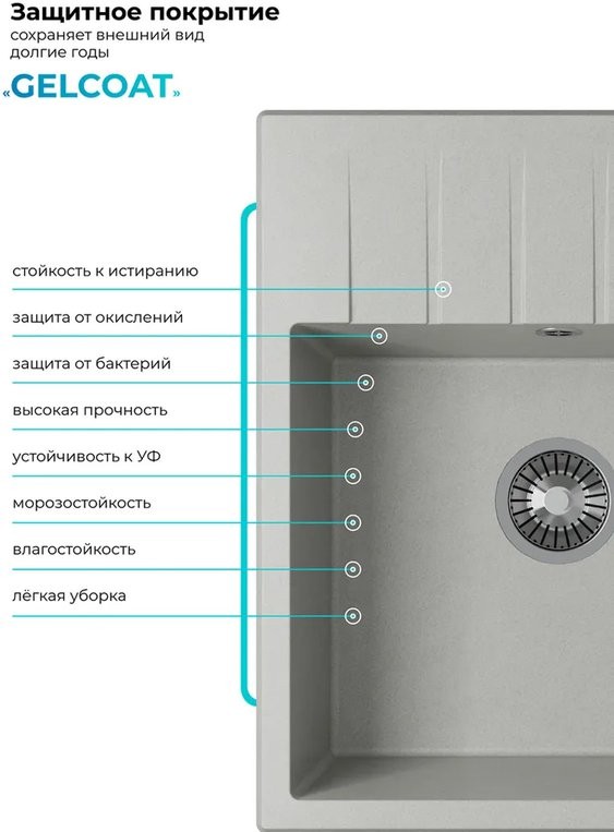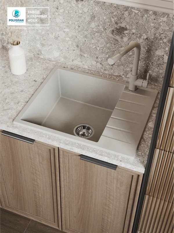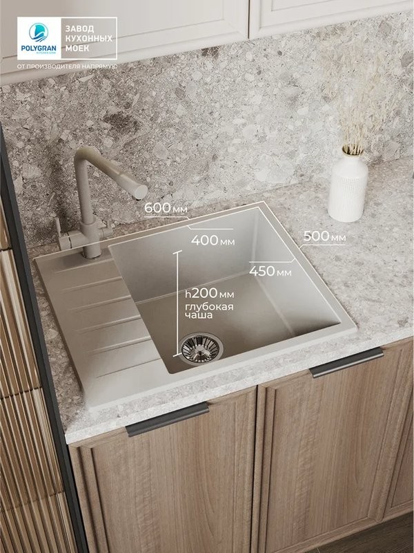Мойка для кухни Polygran DEKA 600 60x50 серый, Ширина: 60 см, Длина: 50 см, Глубина чаши: 20 см, Цвет: Серый, Материал: Искусственный камень