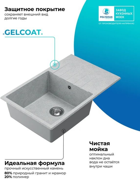 Мойки Polygran обладают высокой механической прочностью благодаря высокотехнологичному производству литья материала, 80% составляет натуральная мраморная крошка и 20% экологически чистого связующего элемента. Материал обладает высокой термоустойчивостью. Добавление специально разработанной добавки в связующий элемент (гелькоут) позволит легко удалить любые загрязнения с поверхности мойки.