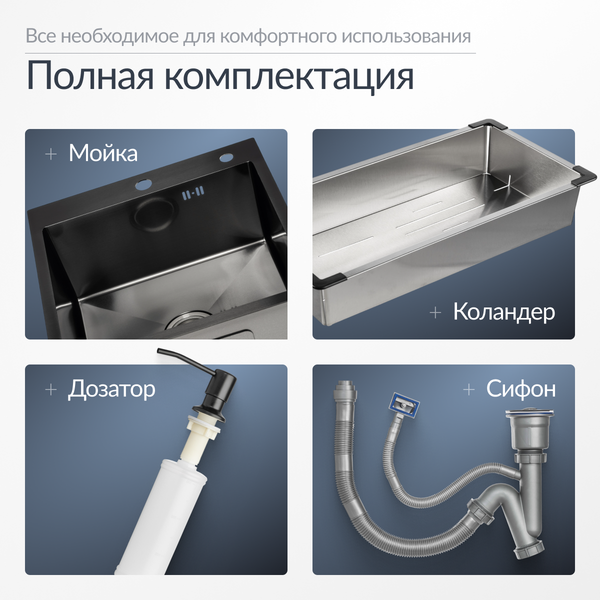 - Комплектация включает сифон, коландер и дозатор для моющего средства, расширяя функциональность мойки для кухни.