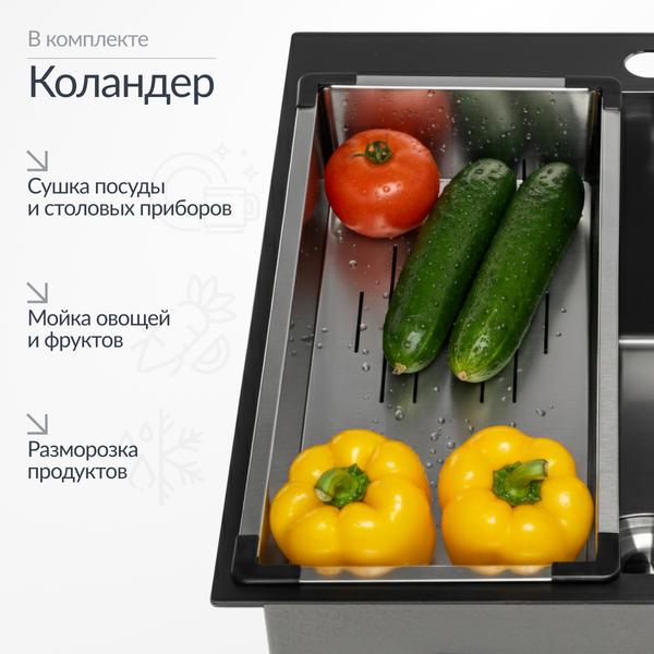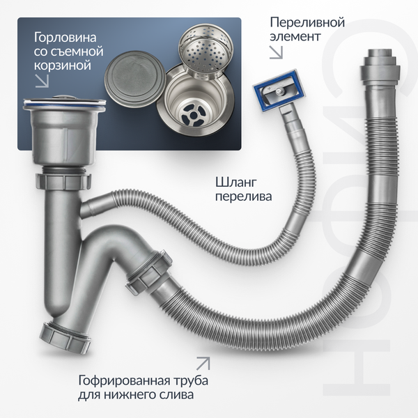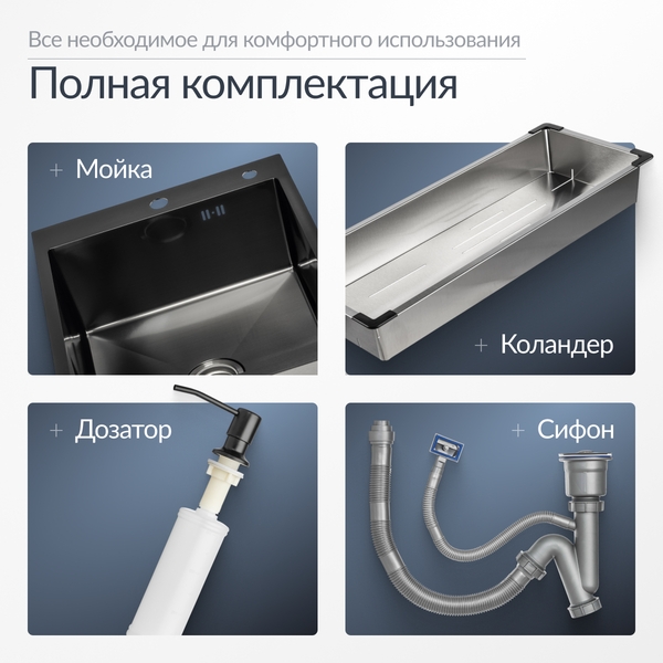 - Комплектация сифоном, коландером и дозатором для моющего средства увеличивает функциональность и удобство использования.