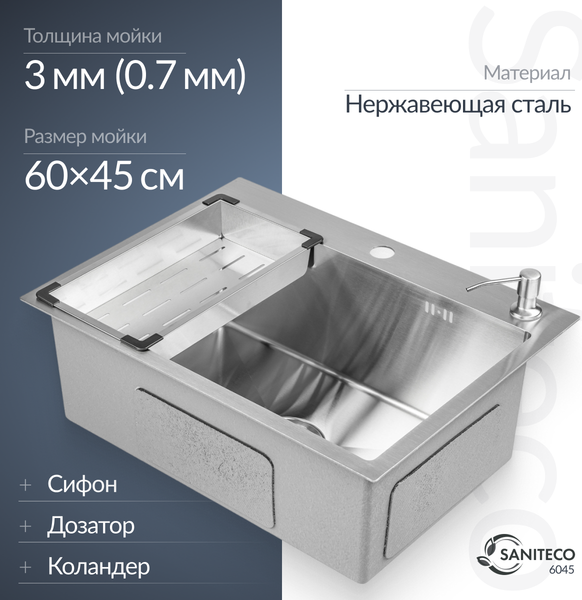 Мойка кухонная Saniteco 6045 (с сифоном, дозатором и коландером)
