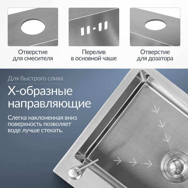 - Прочные материалы: нержавеющая сталь с сатиновой поверхностью.