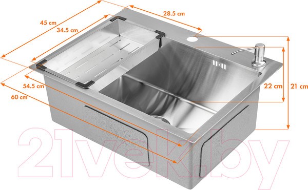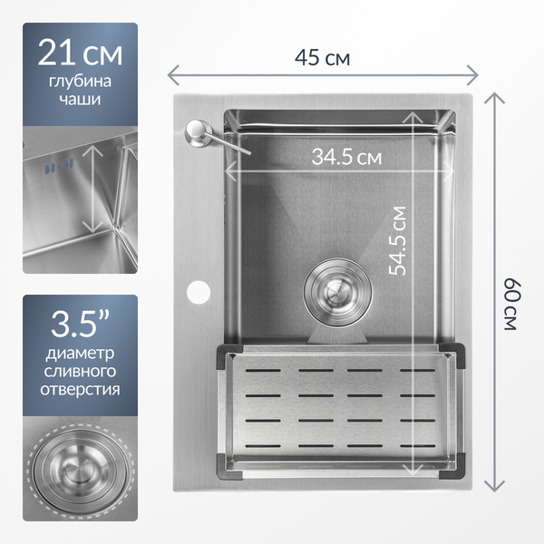 Кухонная мойка 6045 подходит для тех, кто ценит сочетание функциональности и стиля. Габариты мойки составляют 60 см в длину и 45 см в ширину, что обеспечивает достаточное пространство для мытья посуды и приготовления пищи. Основная чаша имеет размеры 54.5 см в длину, 34.5 см в ширину и 21 см в глубину, что позволяет удобно размещать крупные предметы. Общая глубина мойки составляет 22 см, что делает ее практичной для ежедневного использования. Комплектация включает сифон, дозатор и коландер, что упрощает процесс установки и эксплуатации.