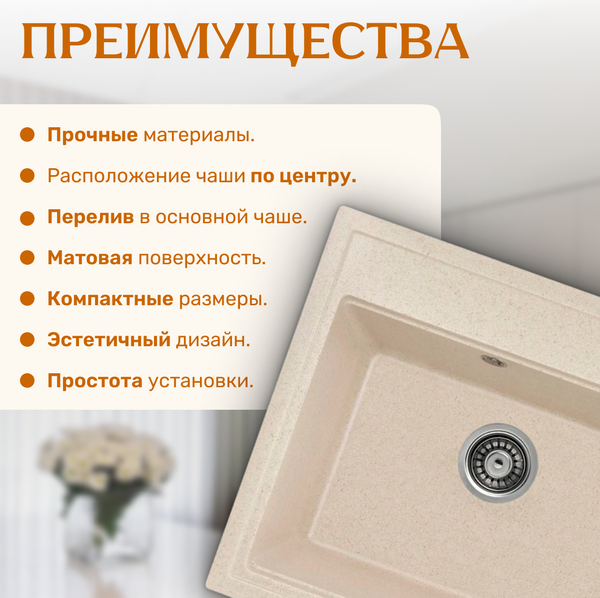 Мойка кухонная Mare — стильный и функциональный элемент, способствующий упрощению работы на кухне. Изготовленная из керамогранита, мойка отличается высокой прочностью и стойкостью к повреждениям. Кухонная мойка имеет прямоугольную форму — универсальное решение для разных кухонных интерьеров.
