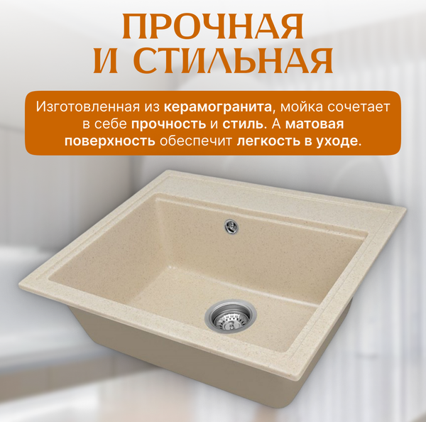 Мойка Mare — разумный выбор для любой кухни. Глубина чаши составляет 18 см, что позволяет удобно мыть крупные кастрюли и сковороды. Керамическая мойка из керамогранита станет надежным помощником на кухне, способствующим поддержанию порядка.