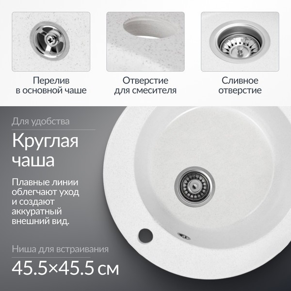 - Отверстие для смесителя — удобство в установке.