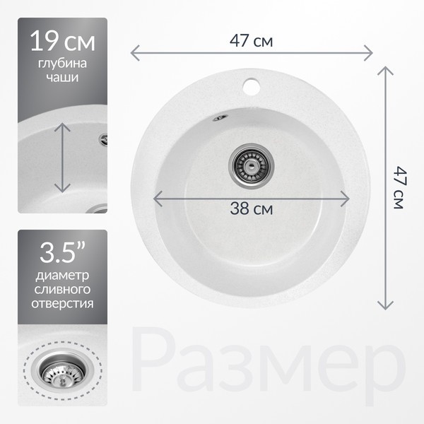 Установка мойки осуществляется врезным способом на столешницу. Основная чаша, расположенная по центру, обеспечивает достаточно пространства для мытья посуды. Диаметр сливного отверстия составляет 3.5″, что способствует эффективному оттоку воды. Ниша для встраивания имеет размеры 45.5 см на 45.5 см, что упрощает процесс монтажа. Отсутствие крыла позволяет оптимизировать пространство на кухне.