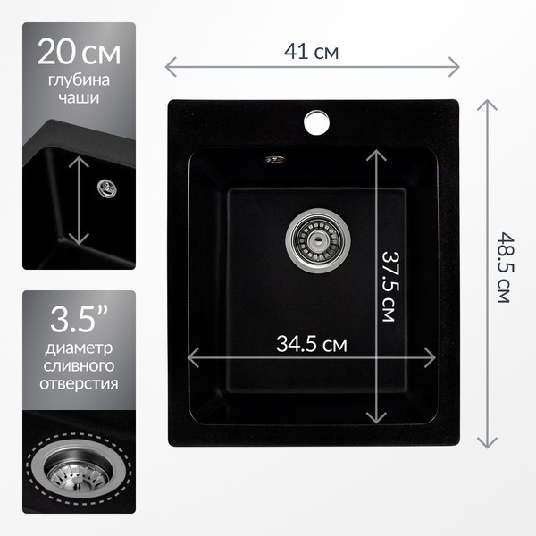 Модель оснащена одной чашей, расположенной по центру, что упрощает процессы мытья и подготовки продуктов. Отсутствие крыла делает мойку компактной, что особенно удобно для небольших кухонь. Перелив в основной чаше предотвращает переполнение и обеспечивает комфортное использование. Наличие отверстия для смесителя упрощает установку необходимого оборудования. Диаметр сливного отверстия составляет 3.5 дюйма, что способствует быстрой утилизации воды.