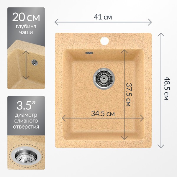Модель имеет одну чашу, расположенную по центру, что упрощает процессы мытья и подготовки пищи. Отсутствие крыла делает мойку компактной, что подходит для небольших кухонь. Перелив в основной чаше предотвращает переполнение и способствует удобству использования. Наличие отверстия для смесителя упрощает установку необходимого оборудования. Диаметр сливного отверстия составляет 3.5 дюйма, что обеспечивает быструю утилизацию воды.