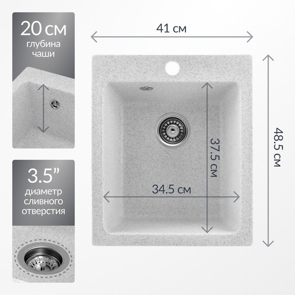 С одной чашей, расположенной по центру, модель обеспечивает максимальную практичность. Отсутствие крыла позволяет экономить место на кухне, а перелив в основной чаше предотвращает переполнение. Отверстие для смесителя упрощает установку необходимых аксессуаров. Диаметр сливного отверстия в 3.5 дюйма гарантирует быструю утилизацию воды.