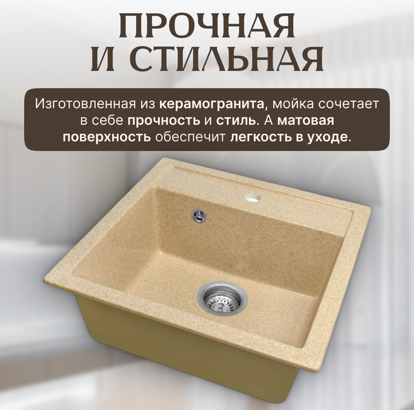 Кухонная мойка Terra станет отличным выбором для тех, кто ценит сочетание стиля и функциональности. Глубина чаши в 20 см подходит для мытья крупных кастрюль и сковород. Бежевый цвет создает атмосферу уюта и комфорт на кухне. Керамическая мойка для кухни способствует удобному выполнению повседневных задач, обеспечивая оптимальные условия для работы на кухне.