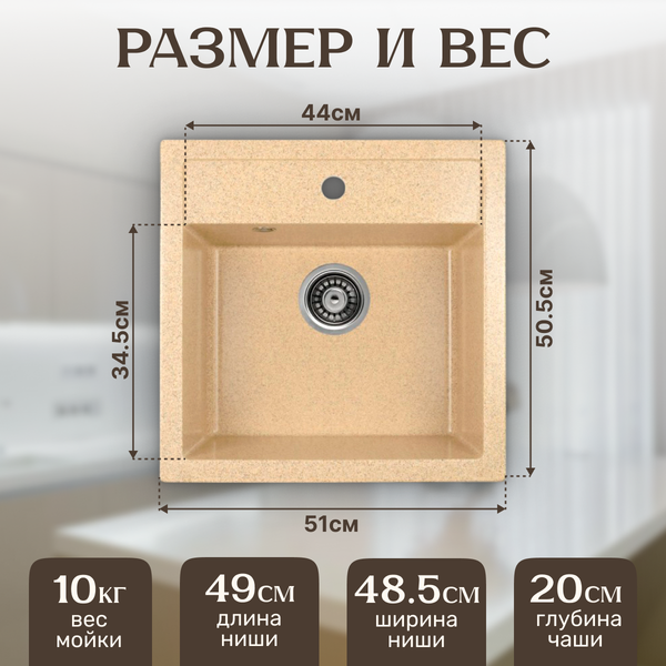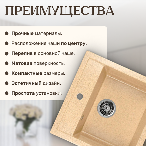 Центральное расположение чаши позволяет удобно использовать мойку. Мойка из керамогранита устойчива к химическим воздействиям, что способствует длительному сохранению ее эстетического вида. Врезная установка позволяет экономить пространство на столешнице и легко интегрировать мойку в интерьер.