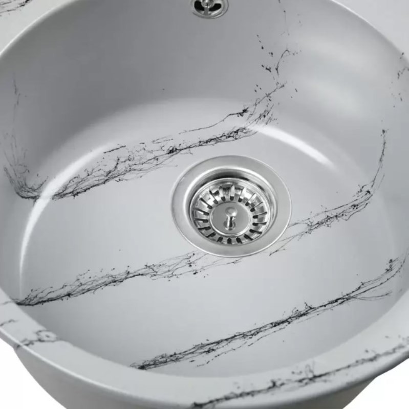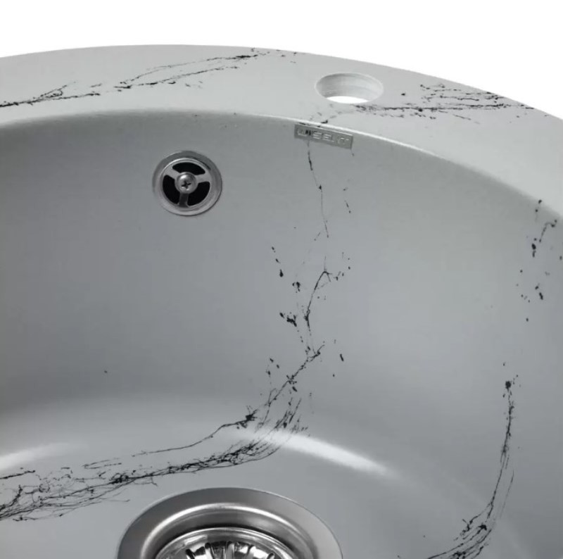 Раковина изготовлена из композитного материала «Искусственный гранит». Состав материала: 80% гранитно-мраморная крошка, 20% полимерные связующие. Данная смесь природных материалов позволяет достичь максимальной прочности моек, их износостойкости и долговечности.