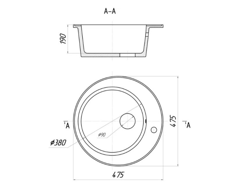 Размер мойки: 475х475х210 (± 5мм) Высота чаши: 190мм, Ø чаши: 380мм