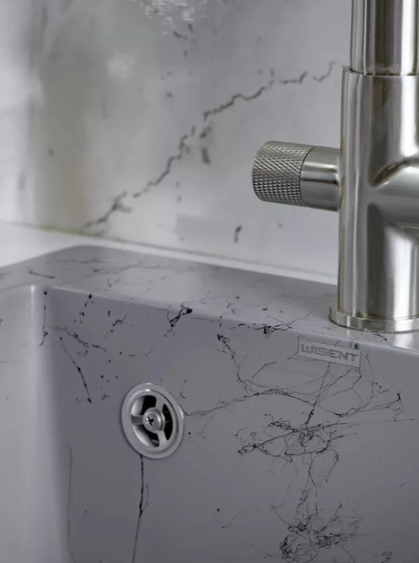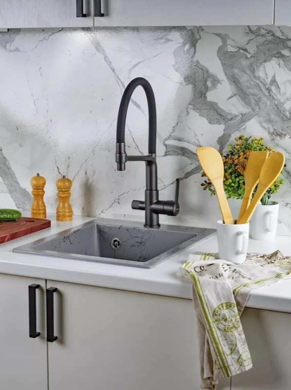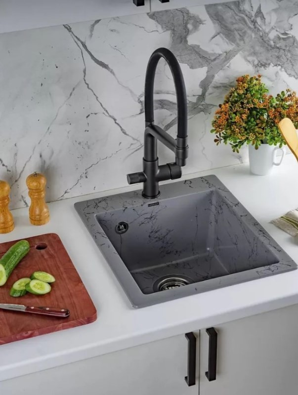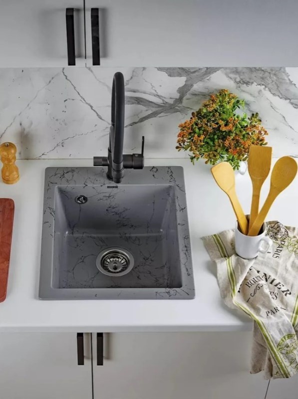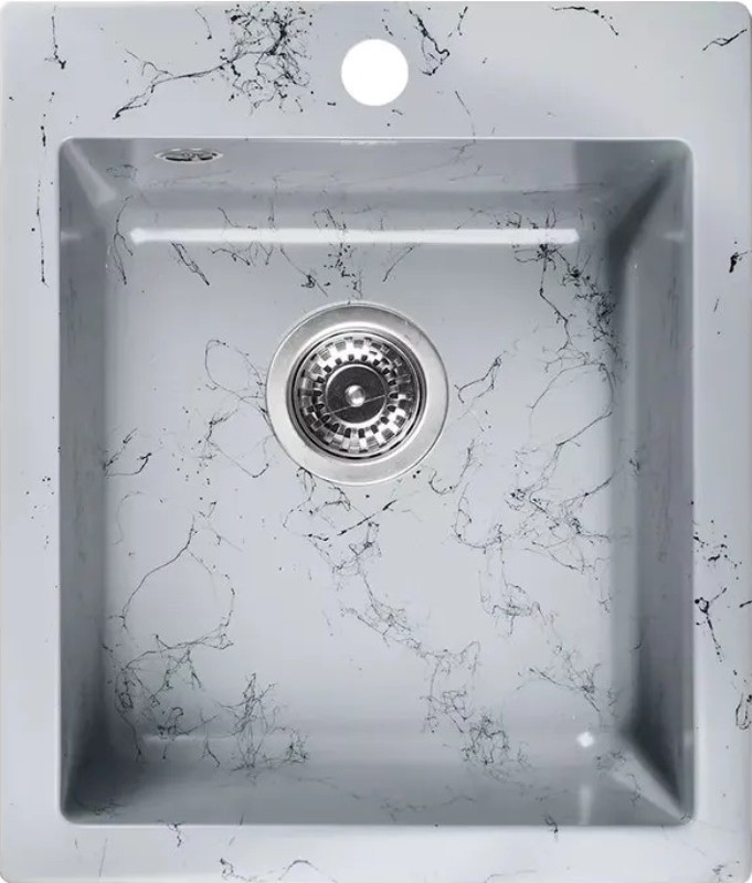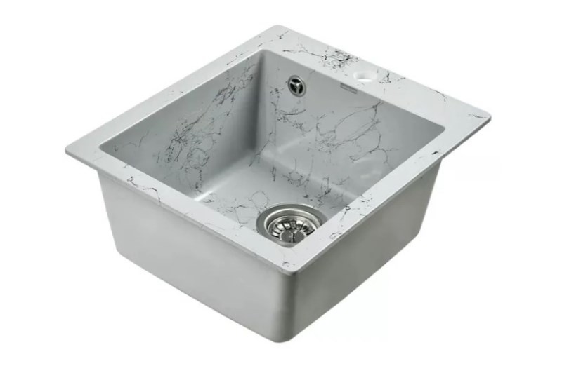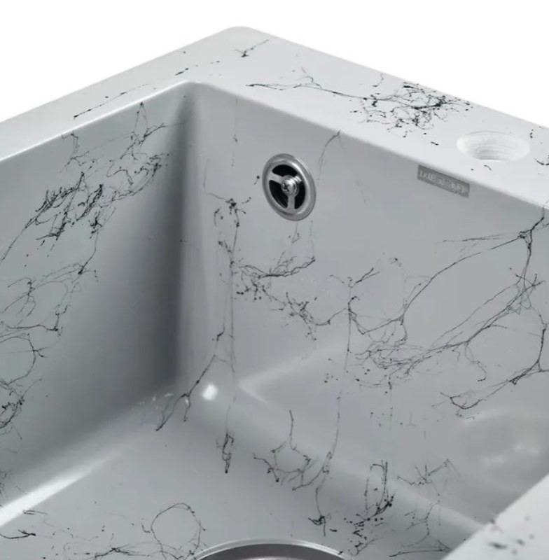 Новая коллекция каменных моек с расцветками под мрамор представляет собой стильные и функциональные решения для вашей кухни, которые способны преобразить любой интерьер и добавить ему изысканности. Мойки доступны в различных оттенках, имитирующих различные виды мрамора, от классического белого до более экзотических цветов, таких как черный или серый мрамор. Это позволяет подобрать мойку, которая идеально сочетается с интерьером вашей кухни и соответствует вашим предпочтениям. Каждая прожилка создана индивидуально, делая каждую мойку уникальной и неповторимой. Классическая прямоугольная мойка компактного размера позволяет установить ее в узкий кухонный модуль. Глубокая чаша вмещает большое количество комплектов посуды. Мойка без крыла имеет готовое отверстие для смесителя Ø35 мм. Раковина изготовлена из композитного материала: 80% гранитно-мраморная крошка, 20% полимерные связующие. Данная смесь природных материалов позволяет достичь максимальной прочности моек, их износостойкости и долговечности. Кухонная мойка обладает следующими преимуществами: устойчивость к термоудару до 180 градусов, не впитывает пищевые красители, имеет защиту от микро-царапин, ультрафиолета, грибковых поражений и запахов, пространственное армирование увеличивает прочность изделия, низкое температурное расширение исключает подвижность мойки на столешнице, что сохраняет гидроизоляцию ее кромки. Мойка укомплектована сифоном, который обеспечивает надежную защиту от засоров и утечек. Выпуск и корзинный клапан изготовлены из нержавеющей стали, комплектующие и винт — из никелированной латуни. Укомплектован гофротрубой для подключения к канализации.