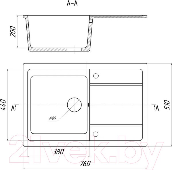 Исполнение мойки оборачиваемое. Мойка может устанавливаться крылом как в левую, так и в правую стороны. Отметки для высверливания отверстия намечены с обратной стороны крыла мойки. Вам остается выбрать нужную сторону и просверлить отверстие. Отверстие рекомендуется делать алмазной коронкой, диаметром 35 мм.