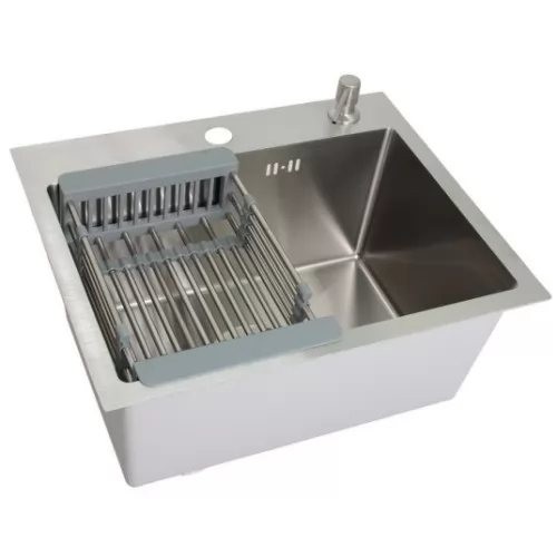 Кухонная мойка Wisent WS-35040/GER013/ WW405A/ W302644. Изготовлена из нержавеющей стали, толщиной: верх - 3 мм, дно - 1.5 мм. Модель комплектуется сифоном, дозатором и коландером. Кухонная мойка из нержавеющей стали WISENT 5044 с коландером и дозатором изготовлена из нержавеющей стали SUS304 толщиной от 1 до 3 мм. Химический состав и свойства делают марку 304 наиболее подходящей для применения в пищевой промышленности. Она показывает высокие характеристики коррозийной стойкости в агрессивных средах. Шумоизоляция, нанесенная путем напыления, позволяет значительно снизить звук от потока воды. Минимальный размер отверстия в столешнице для врезной установки: ширина 46 см, глубина 36 см. Универсальный телескопический коландер позволяет более рационально использовать пространство кухонной мойки. Он размещается в чаше и позволяет размораживать продукты или сушить посуду после мытья. Врезной дозатор для жидкого мыла или средства для мытья посуды поможет освободить место на кухне.