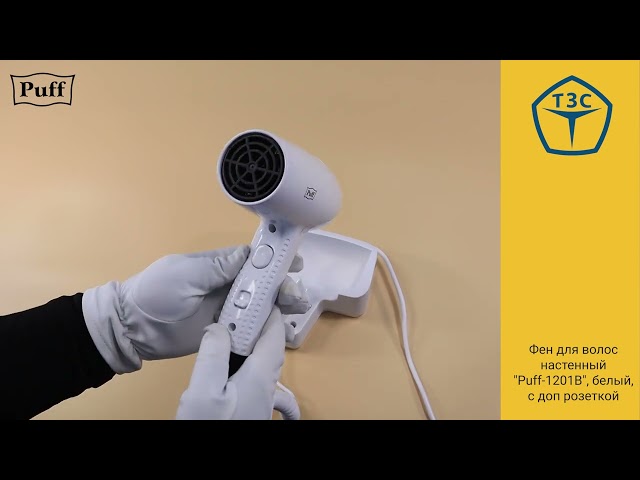 Фен для волос Puff-1201B предназначен для стационарного монтажа в туалетных и ванных комнатах. Включение кнопкой на ручке.