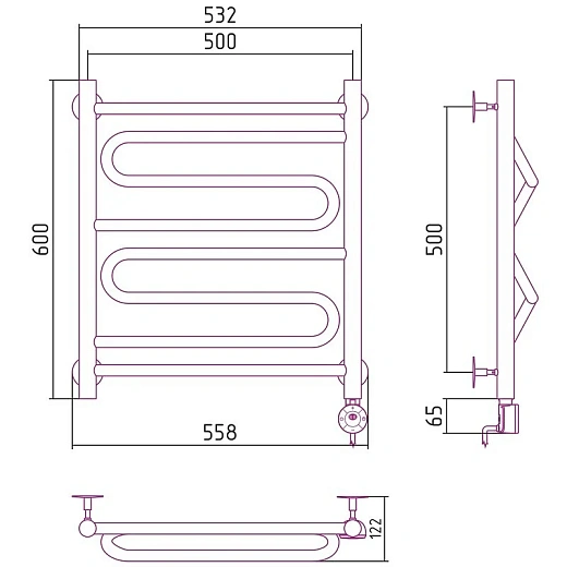 Полотенцесушитель электрический Стилье Формат 22, 50/60, 600x500, ТЭН справа, белый матовый, 30522-6050
