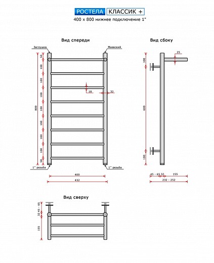Полотенцесушитель Ростела Классик+ нижнее подключение 1" 40x80 9 перекладин с полкой