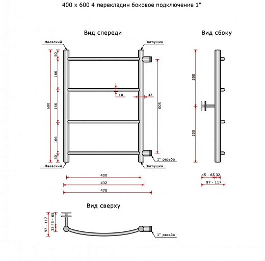 Полотенцесушитель Ростела Соната боковое подключение 1' 4 перекладины 40х60 см