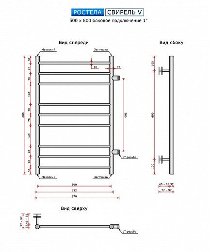Полотенцесушитель Ростела Свирель V боковое подключение 1" 50x80 9 перекладин черный