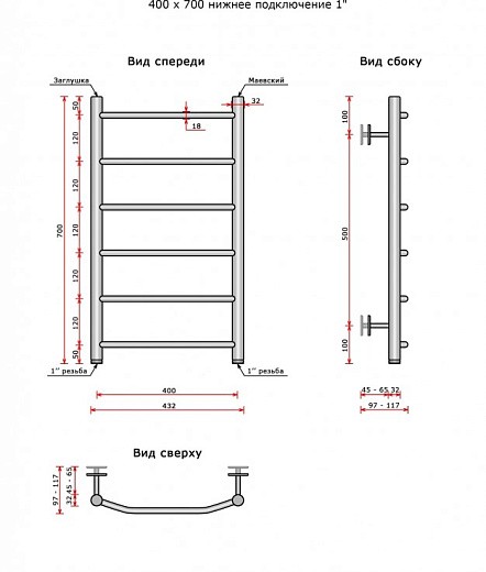 Полотенцесушитель Ростела Трапеция нижнее подключение 1' 6 перекладин 40х70 см