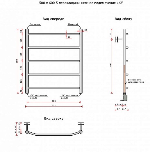 Полотенцесушитель Ростела Трапеция нижнее подключение 1/2' 5 перекладин 50х60 см