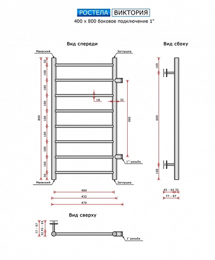 Полотенцесушитель Ростела Виктория боковое подключение 1" 40x80 8 перекладин