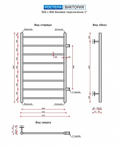 Полотенцесушитель Ростела Виктория боковое подключение 1" 50x80 8 перекладин черный