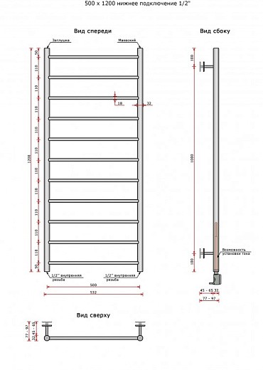 Полотенцесушитель Ростела Виктория нижнее подключение 1/2' 11 перекладин 120 см
