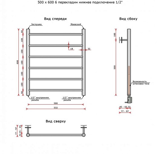 Полотенцесушитель Ростела Виктория нижнее подключение 1/2' 6 перекладин 60 см