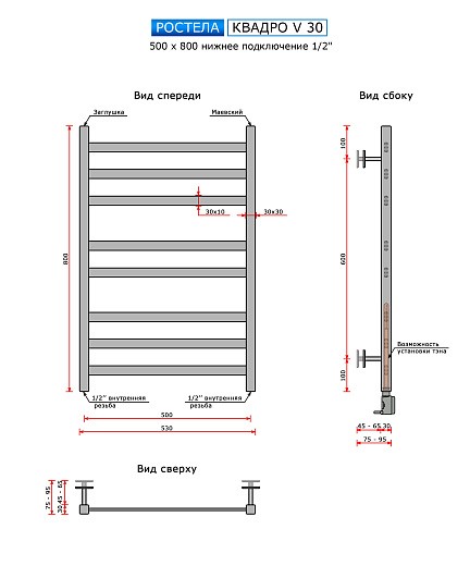 Полотенцесушитель водяной Ростела Квадро V 30 нижн.подв.1/2" 500х800/8 Ral 9016 белый